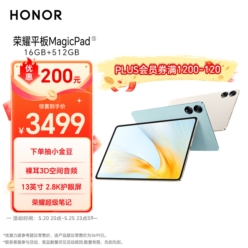 荣耀MagicPad 13英寸平板电脑(16+512GB 2.8K超清 144Hz高刷巨屏 专业级8扬声器 10050mAh)天青色价格:3499.00元!
