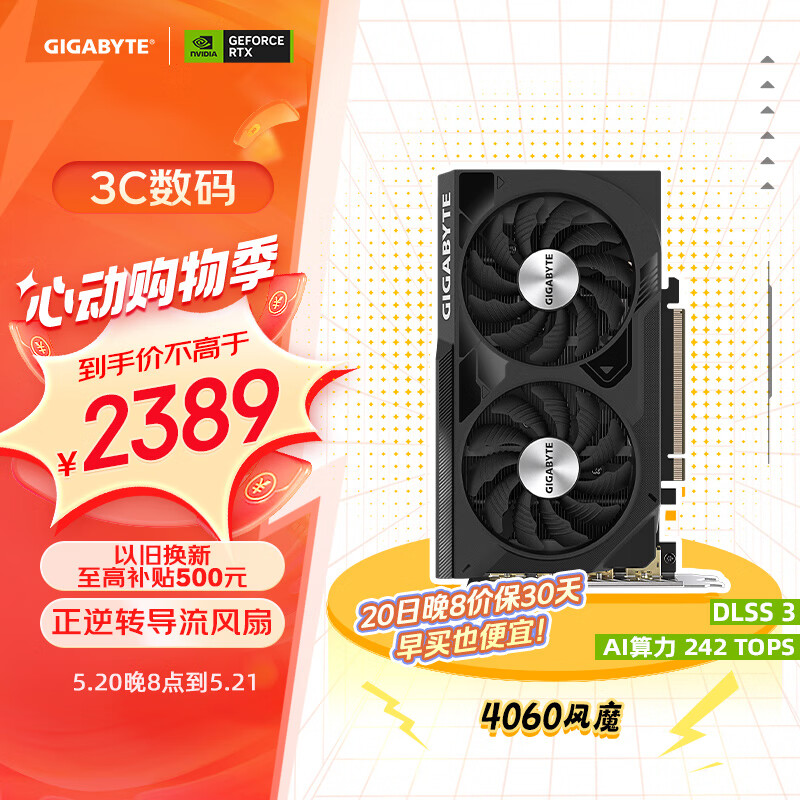 技嘉(GIGABYTE)风魔 GeForce RTX 4060显卡 WINDFORCE OC 8G DLSS 3 电竞游戏设计智能学习电脑独立显卡价格:2549.00元!