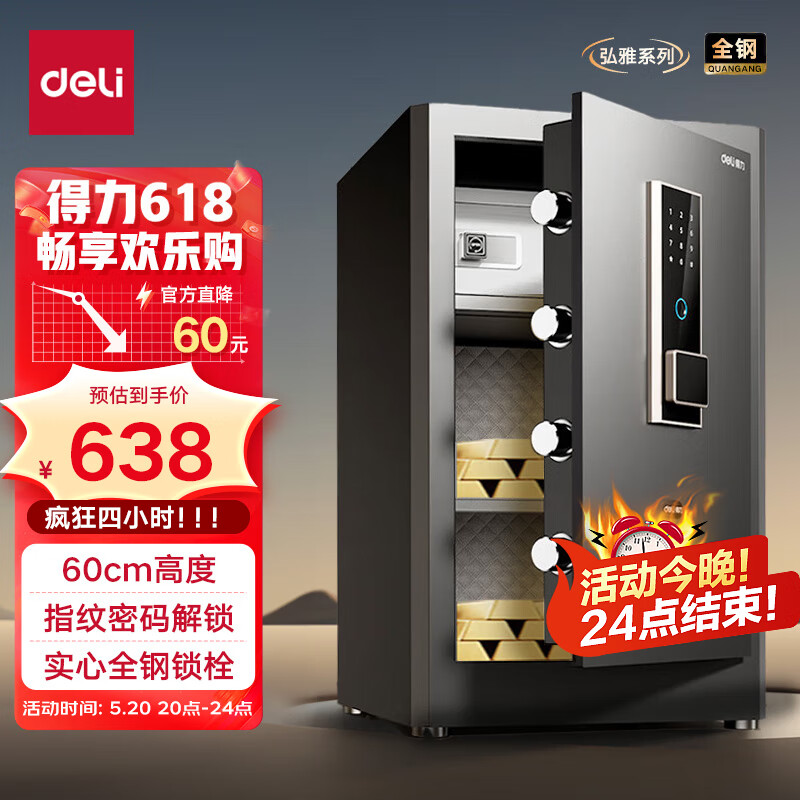 得力保险柜 家用指纹密码保险箱办公小型保密箱可入墙入柜保险箱床头保管箱 60cm曜岩黑 弘雅系列价格:698.00元!