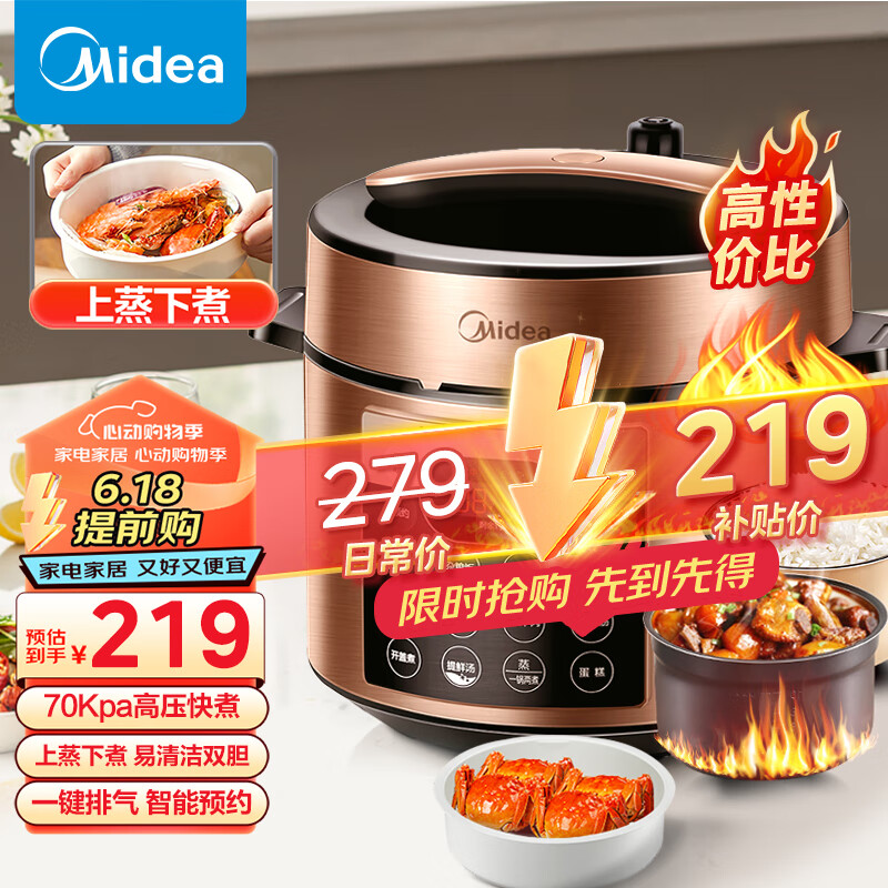 美的(Midea)提鲜系列电锅 5L全自动家用智能预约 上蒸下煮 不粘双胆煲汤炖肉YL50Q3-451电饭煲高压锅2-6人价格:219.00元!