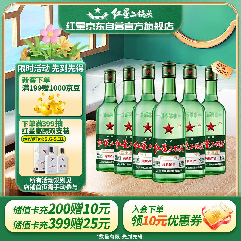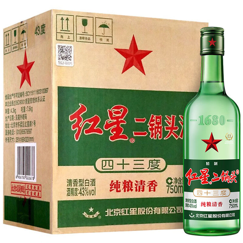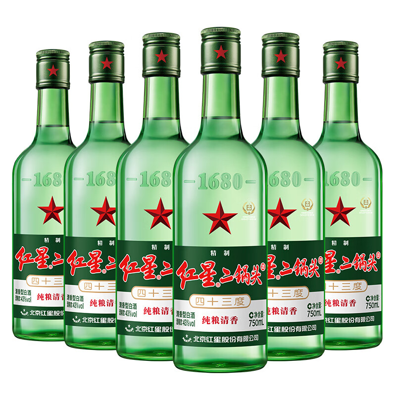 红星二锅头大二 清香型白酒 43度 750ml*6瓶 整箱装 口粮酒价格:176.00元!