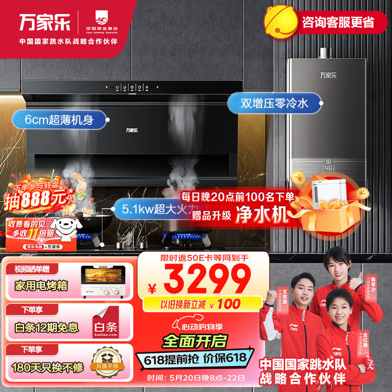 万家乐顶侧双吸油烟机 23立方厨卫烟灶热三件套装 16L双增压零冷水热水器套装TAK5+TAC5+16DL1天然气价格:3449.00元!