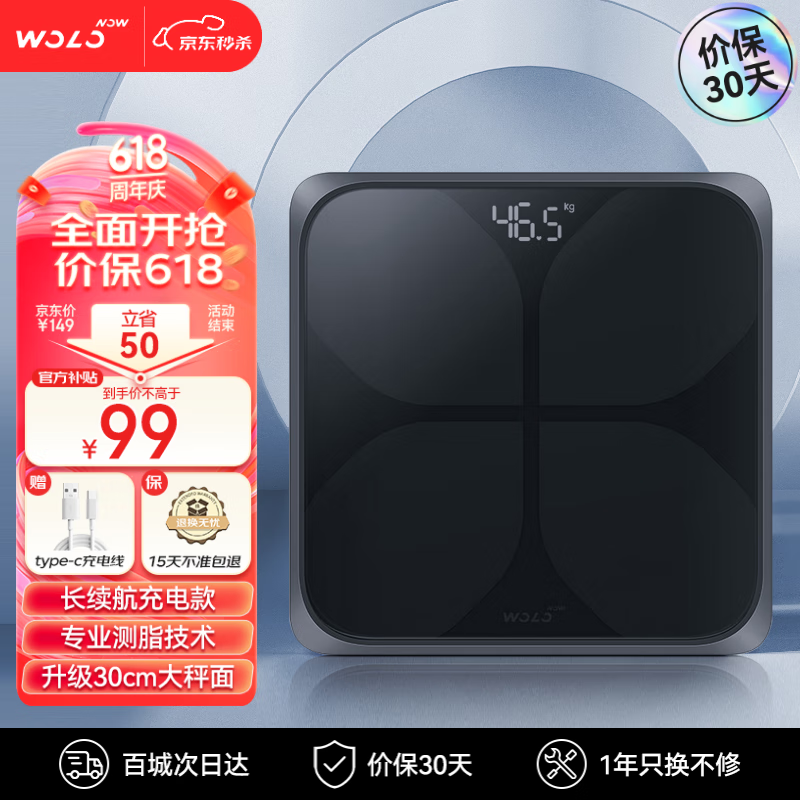 沃乐WOLO智能体脂秤Pro【升级大秤面充电款】电子体重秤家用高精准人体脂肪减肥健康称APP款 曜石黑价格:149.00元!
