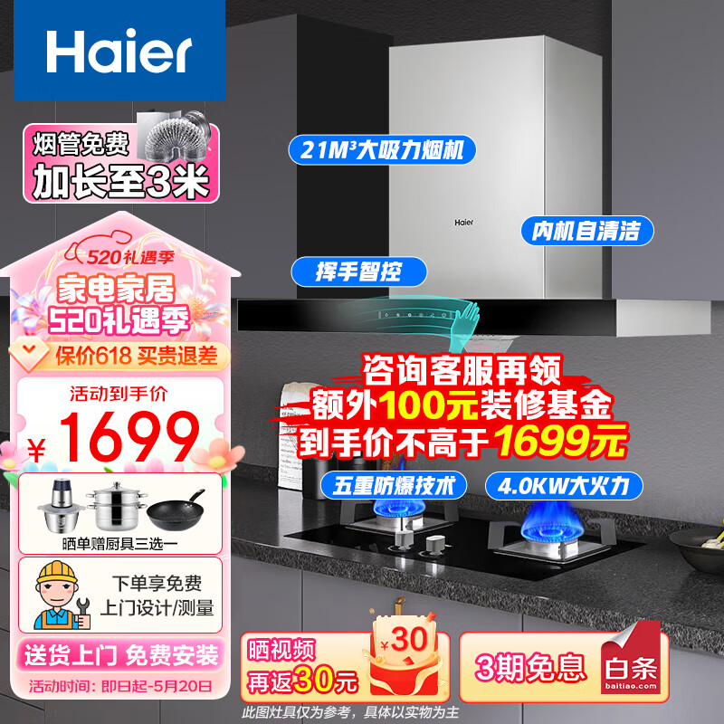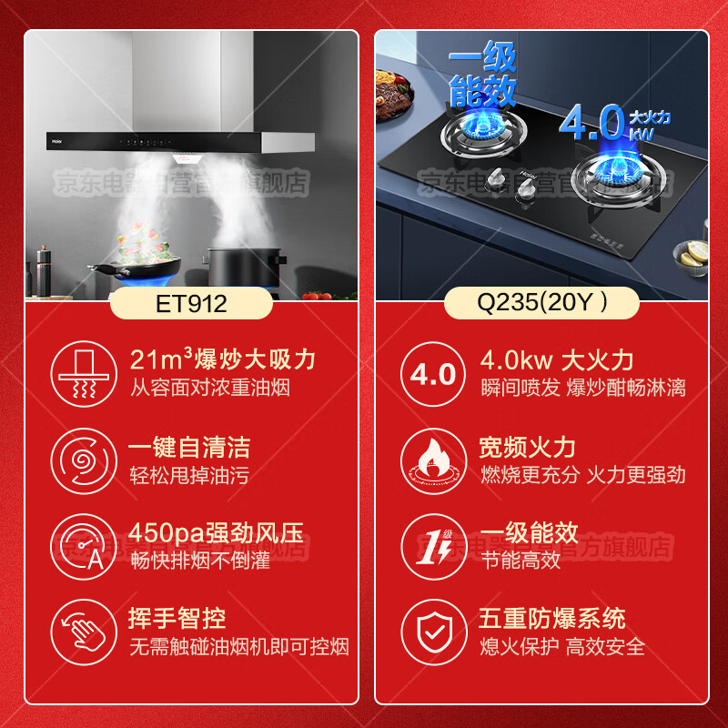海尔(Haier)抽油烟机燃气灶套装 欧式顶吸自清洁挥手开关 21m3大吸力吸油烟机家用 ET912烟灶套装4KW灶[家电]价格:1899.00元!