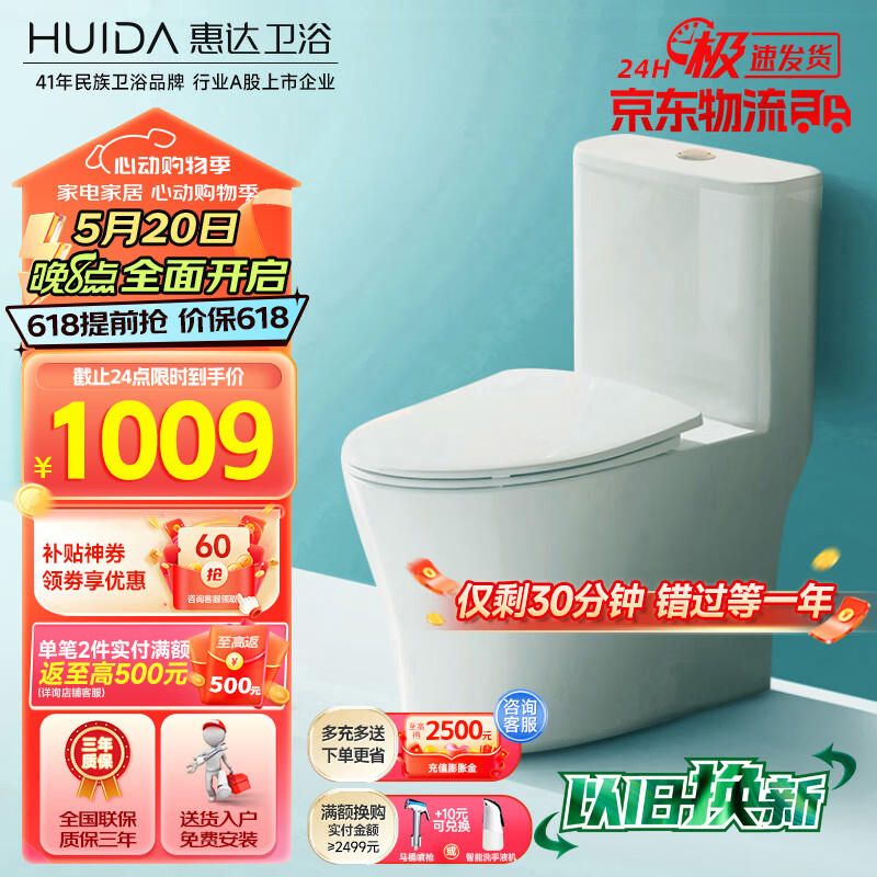 惠达(HUIDA)抽水马桶家用大冲力节水虹吸式卫生间坐便器HDC6360A 305坑距价格:1369.00元!