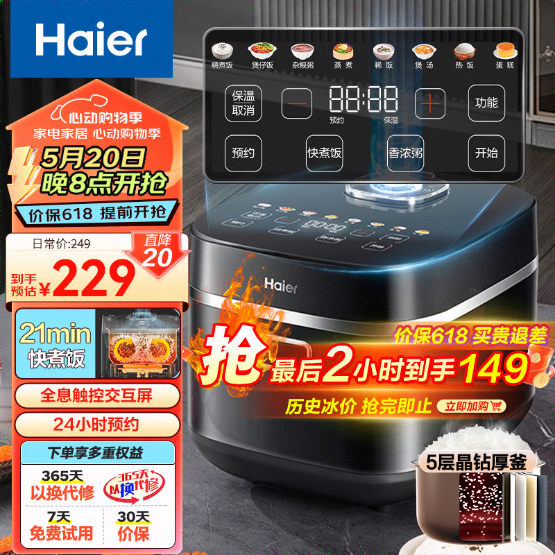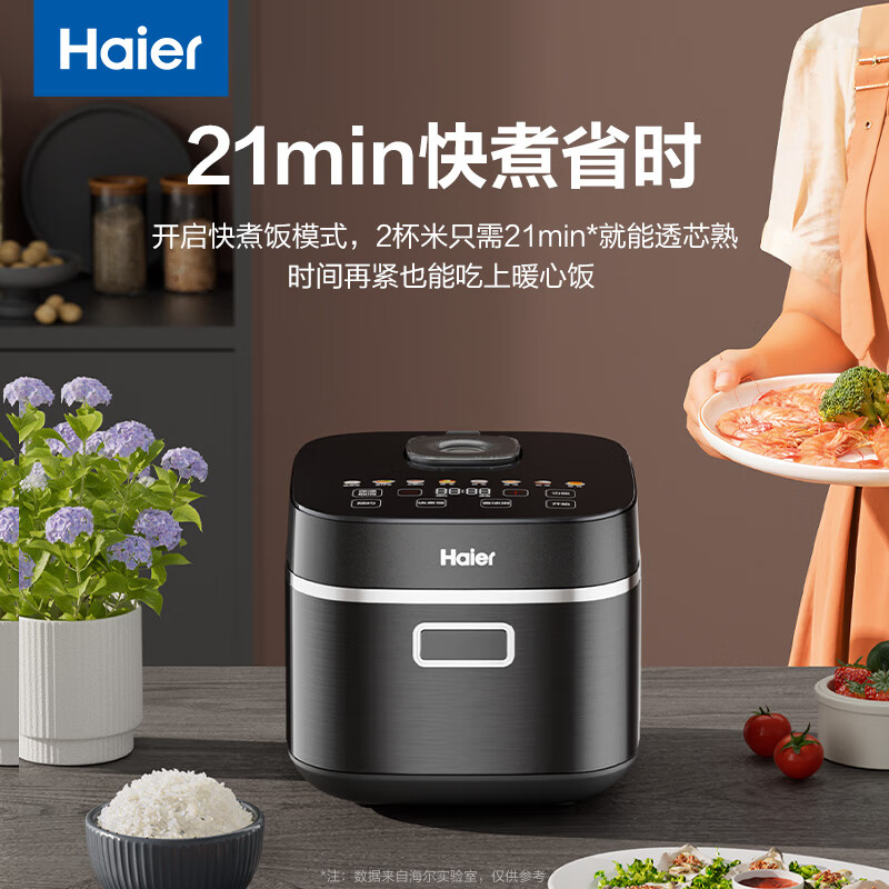 海尔(Haier)电饭煲电饭锅4L晶钻厚釜内胆全息触控屏3-8人七段加热多功能家用智能电饭煲焖香阀防溢锅JC2S4020价格:229.00元!