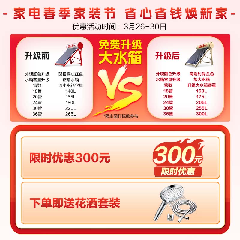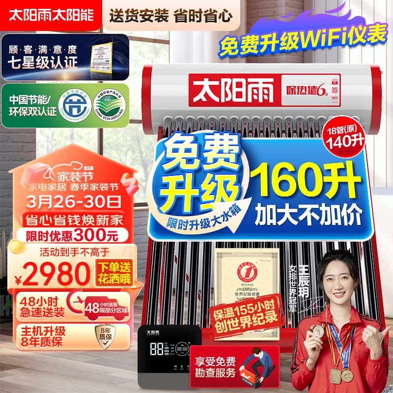 太阳雨(Sunrain)太阳能热水器家用全自动上水 光电两用 一级能效 配智能仪表电加热 140L保热墙6代18管价格:3280.00元!