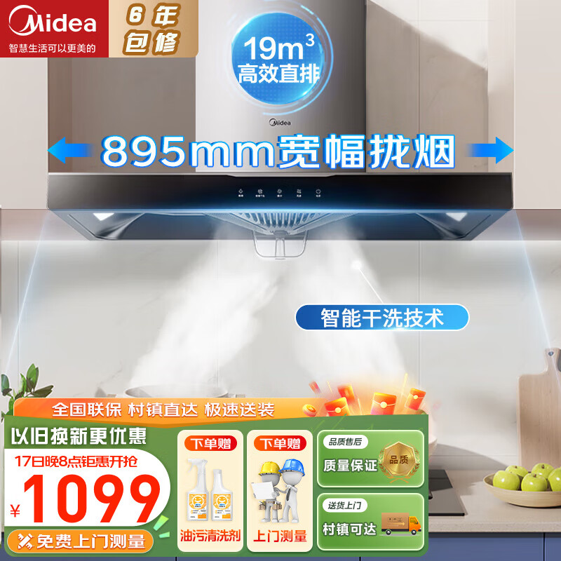 美的(Midea)抽油烟机家用爆炒21立方大吸力顶吸脱排油烟机欧式烟灶套装自清洗触屏吸油烟机 以旧换新 触控面板 19吸力智能干洗T33A 智能家电价格:1099.00元!