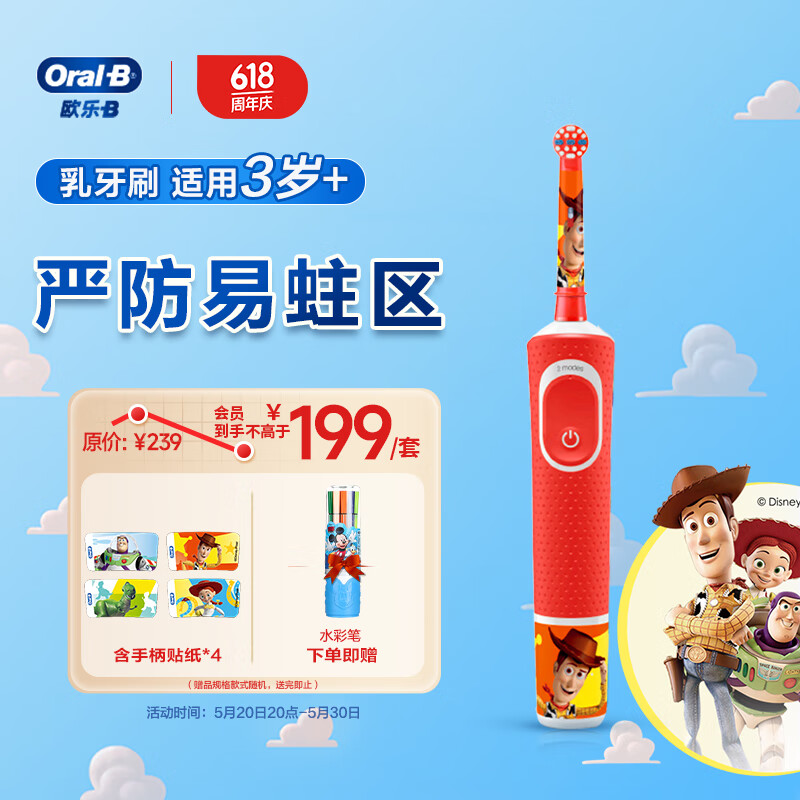 欧乐B儿童电动牙刷 3-7岁乳牙期专用护齿乳牙刷 玩具总动员/皮克斯(图案随机)D100K kids 日常清洁价格:199.00元!