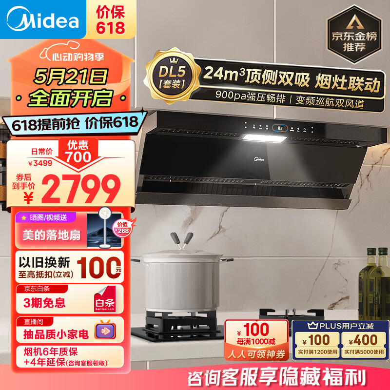 美的(Midea)抽油烟机燃气灶具家用顶侧双吸烟灶联动智控变频24风量大吸力超薄近吸烟灶套装DL5+Q523L天然气价格:2999.00元!