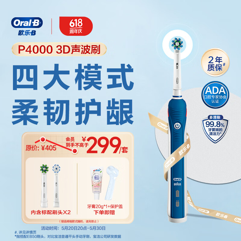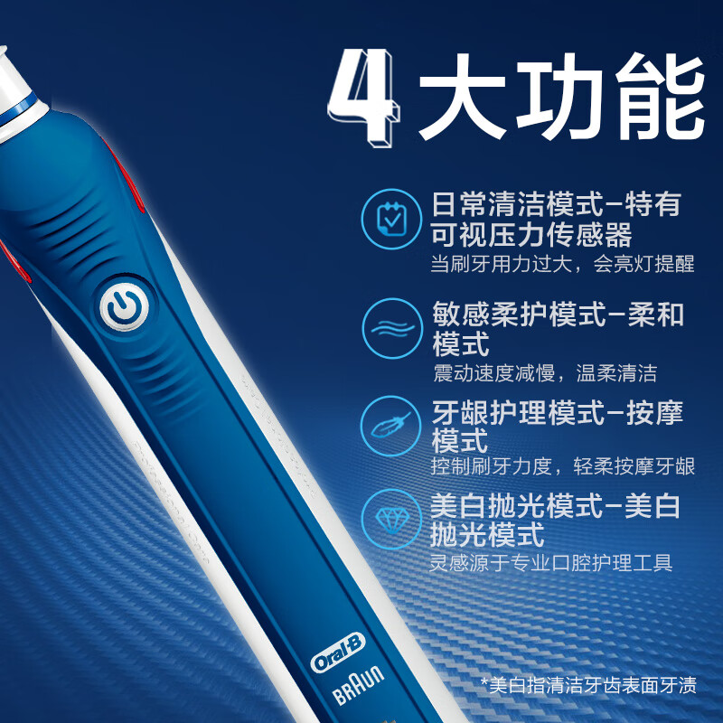 欧乐B成人电动牙刷成人P4000深度清洁牙龈按摩3D声波P系列圆头送男友送女友情侣送礼赠生日礼物520礼物价格:346.00元!