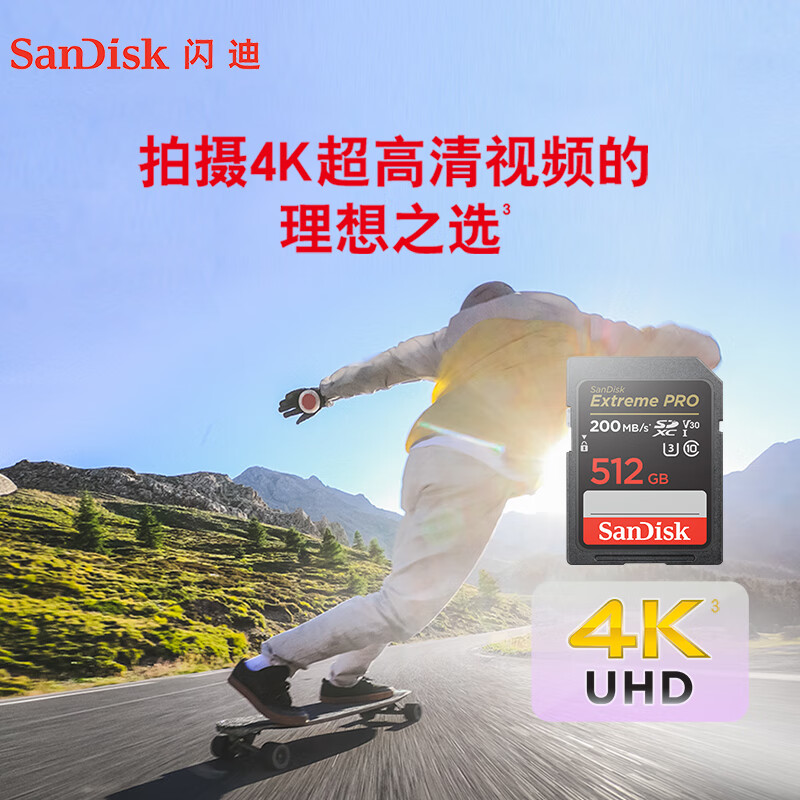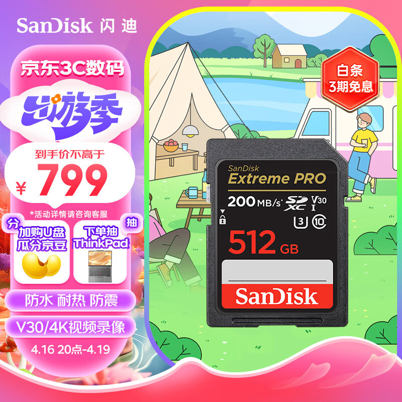闪迪(SanDisk)512GB V30 SD内存卡U3 C10 4K相机存储卡 读速200MB/s 写速140MB/s 微单/单反相机扩容价格:799.00元!