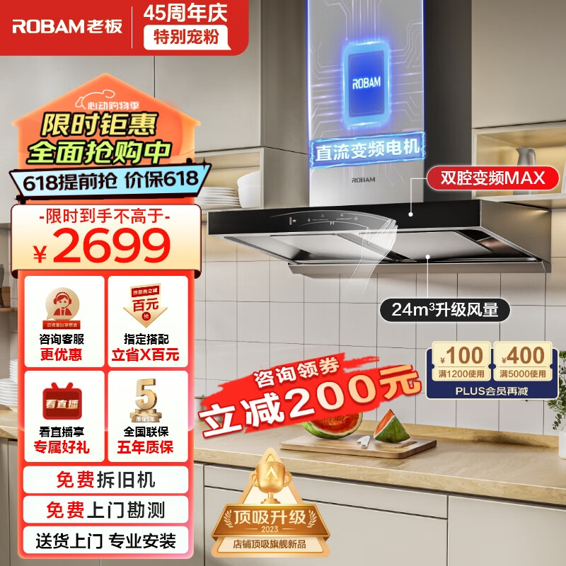 老板(Robam)抽油烟机欧式双腔变频油烟机家用大吸力24大风量吸油烟机顶吸式挥手智控以旧换新排油烟机60D3S价格:2899.00元!