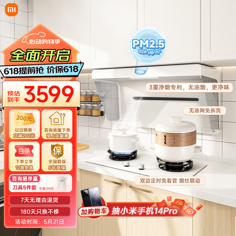 米家小米抽油烟机净烟机小白净S2白色家用吸油烟机7字型超薄天然气大吸力烟灶套装变频侧吸烟灶联动价格:3599.00元!