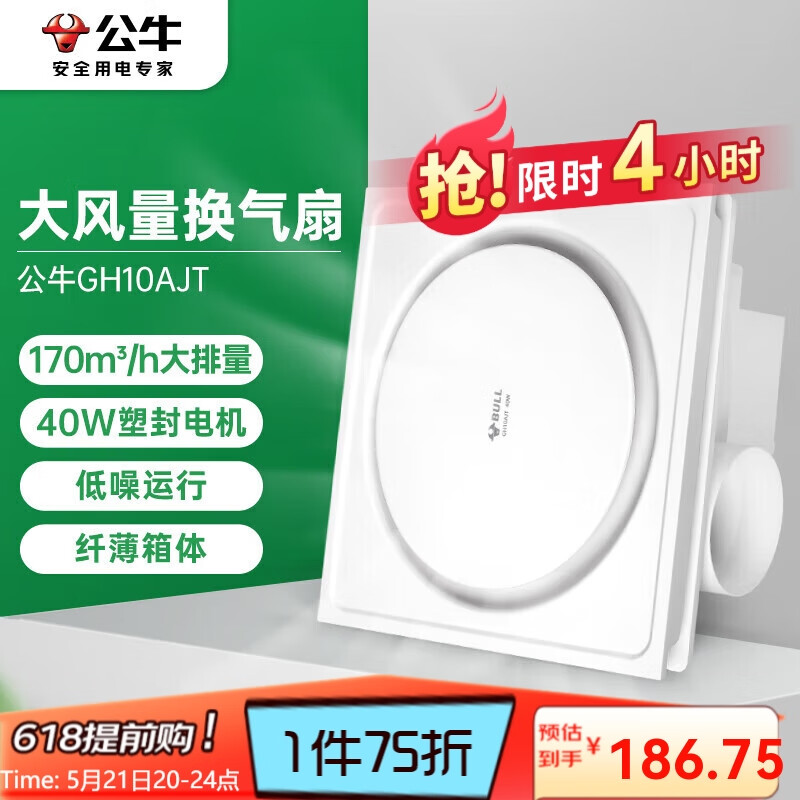 公牛(BULL)排气扇换气扇 GH10AJT厨房卫生间40W、170m3/h大风量换气低噪舒适价格:249.00元!