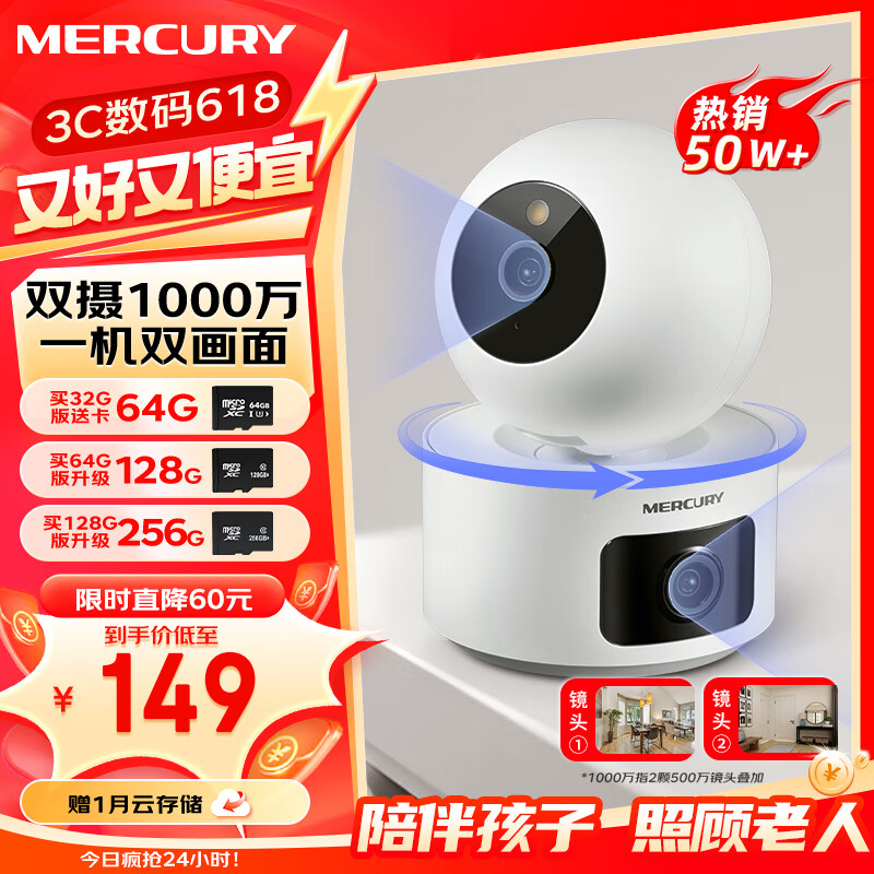 水星(MERCURY)双摄1000万3K摄像头家用监控器360度全景无线家庭室内通话网络手机远程婴儿看护器宝宝监护价格:209.00元!