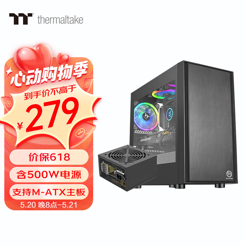 Thermaltake(Tt)启航者F1 机箱电源套装台式机电脑主机(含500W电源/支持M-ATX主板/支持背线/大侧透/U3)价格:279.00元!