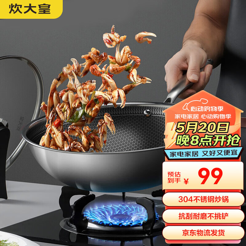 炊大皇 炒锅 304不锈钢炒菜锅煎锅 平底不粘炒锅32cm 可立可视盖不挑灶价格:99.00元!