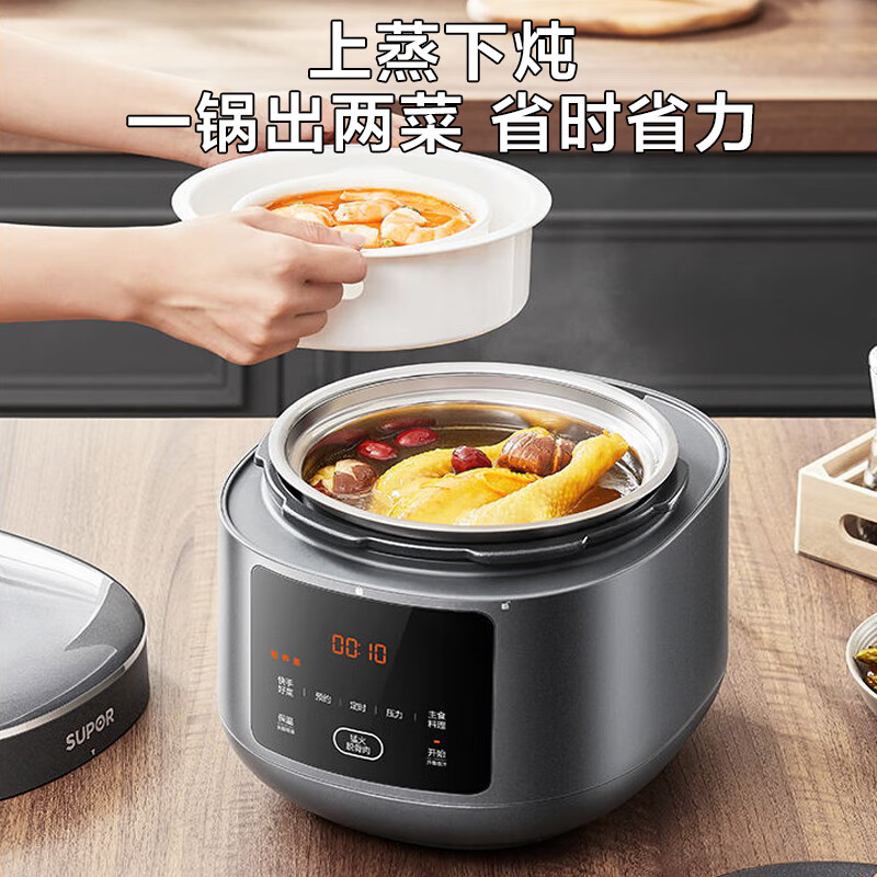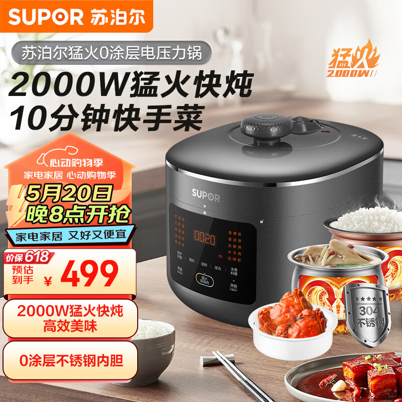 苏泊尔(SUPOR)猛火系列电锅5L家用 智能预约10min菜2000W煲汤 0涂层钢球釜SY-50FC5009Q双胆高压锅3-6人价格:499.00元!