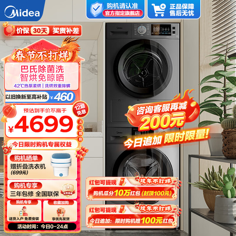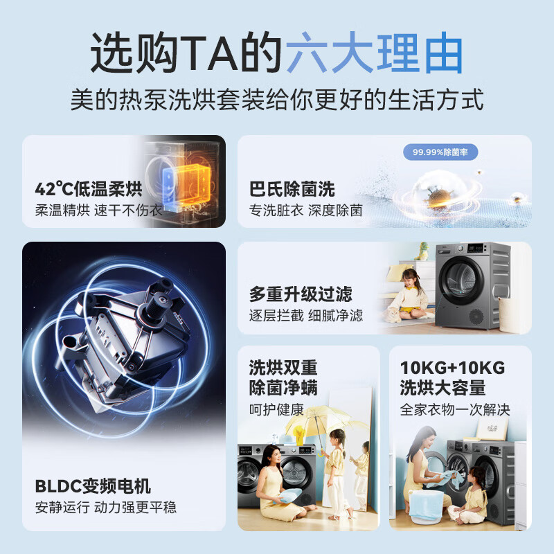 美的(Midea)洗烘套装洗衣机烘干机一体10kg+10kg 热泵烘干 紫外线除菌除螨祛除毛发 MG100V33WY+MH100VH03Y价格:4699.00元!