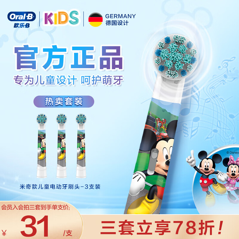 欧乐B儿童电动牙刷头3支装适用D103KD100KPro1kids米奇图案EB10/EB10S-3K标准型软毛(图案包装随机发)价格:119.00元!