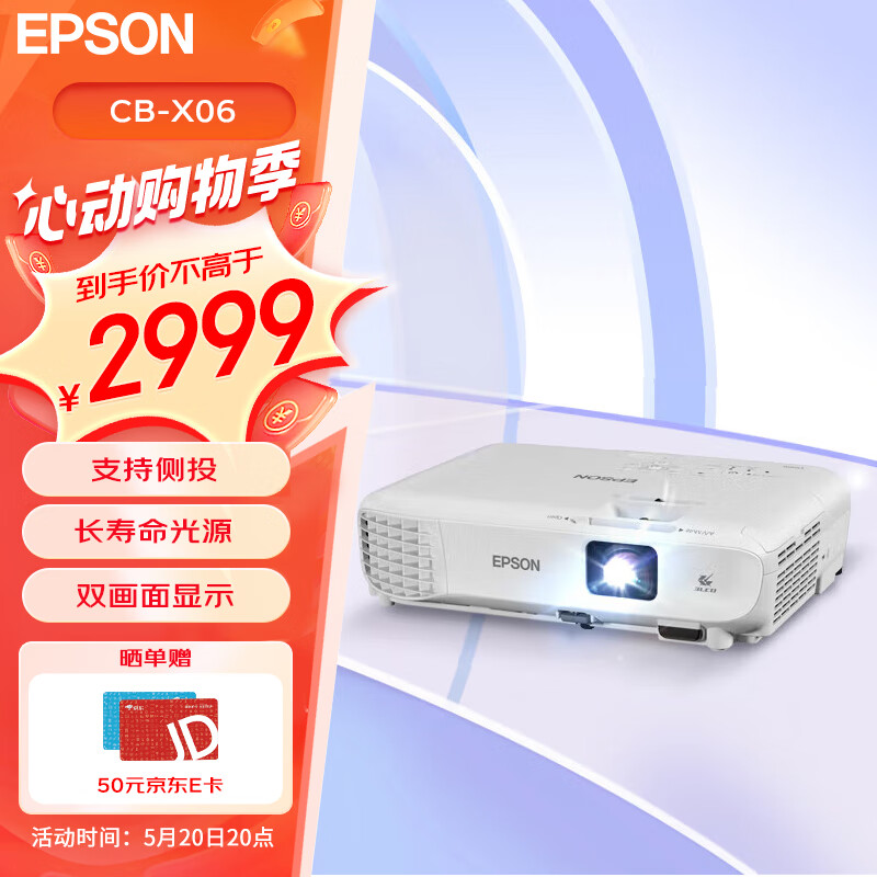 爱普生(EPSON) CB-X06 投影仪 投影机办公 培训(标清XGA 3600流明 滑动镜头盖)价格:2999.00元!