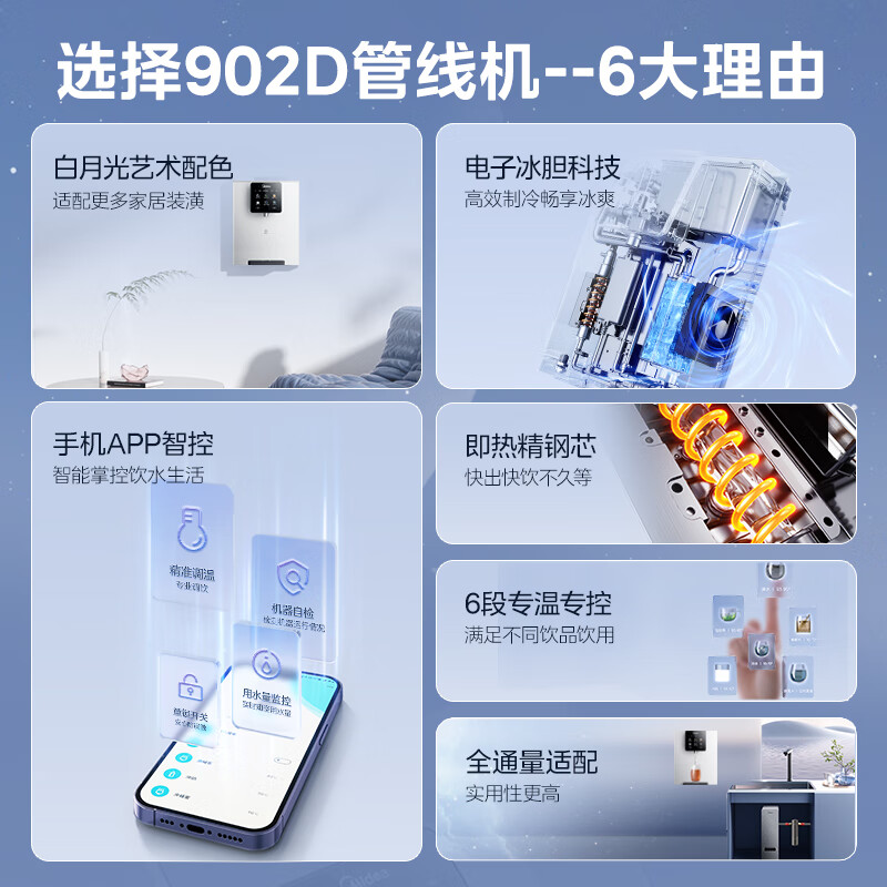 美的(Midea)家用净水器伴侣 白月光管线机 全通量适配 6段控温 智能触控 壁挂式直饮机 速热饮水机 MG902-D价格:2299.00元!
