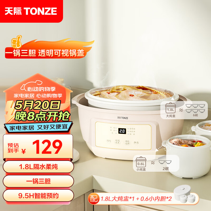 天际(TONZE)电炖锅 电炖盅 隔水炖锅 煲汤锅炖汤锅煮粥锅燕窝炖盅养生1-3人白瓷胆 DGGD23A183BAW 1.8L价格:129.00元!