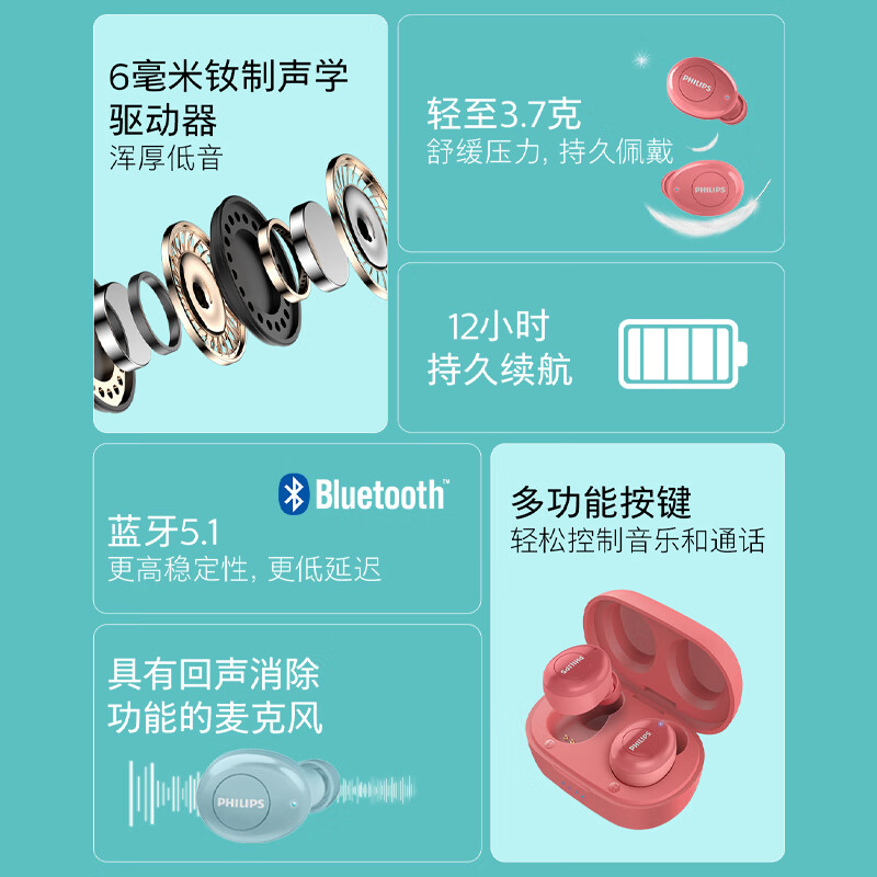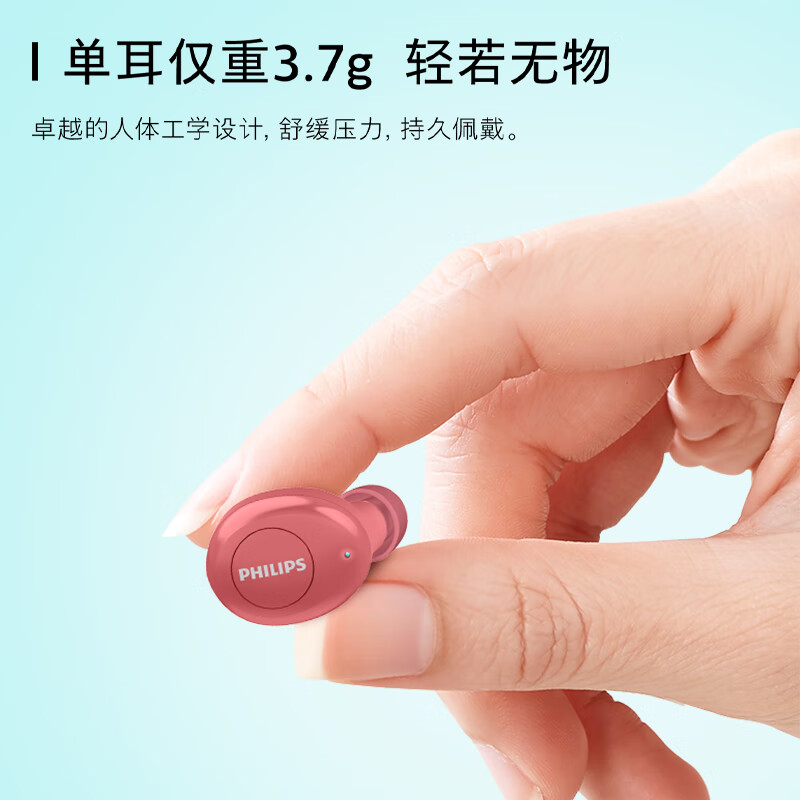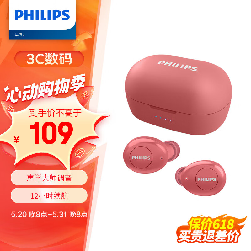 飞利浦(PHILIPS)真无线蓝牙耳机无线耳机音乐游戏耳机双麦回音降噪苹果华为小米安卓手机通用TAUT102S粉价格:109.00元!