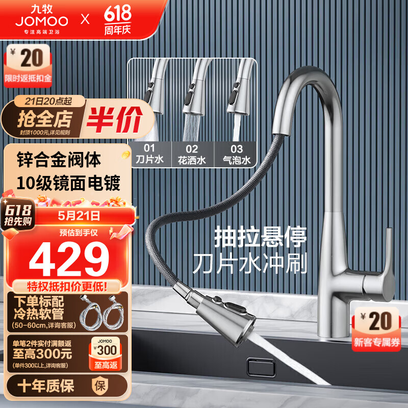 九牧(JOMOO)抽拉悬停厨房水龙头冷热出水可旋转三档切换龙头33098-385/1B2-Z价格:479.00元!