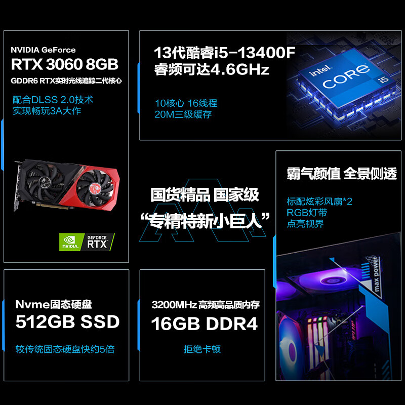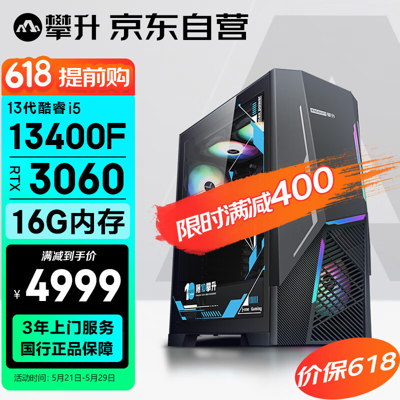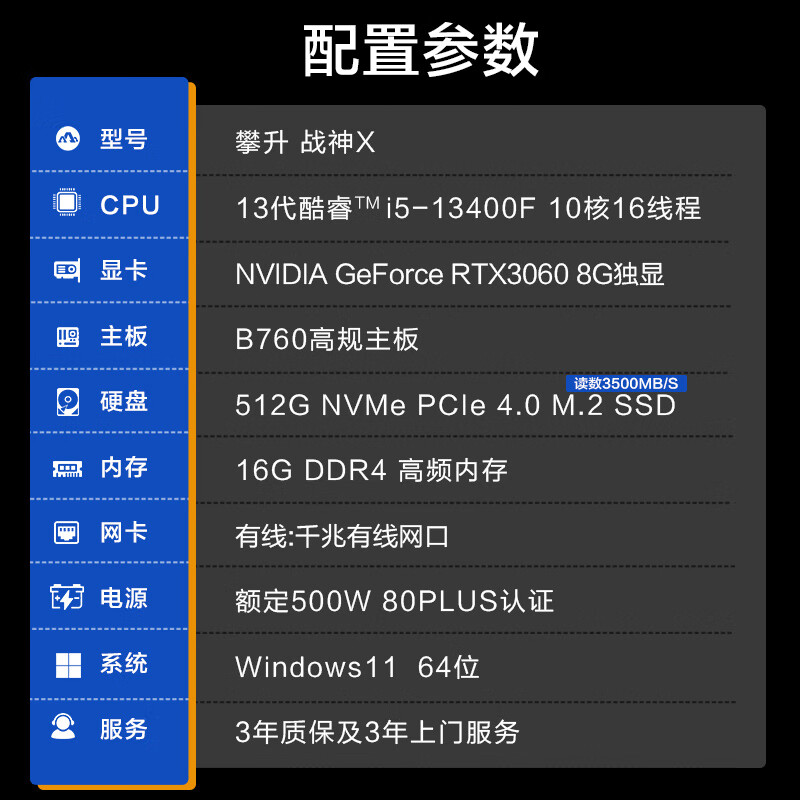 攀升 战神X 台式电脑游戏台式机电脑主机组装电脑主流游戏全套(13代酷睿i5 RTX3060 16G 512G)价格:5399.00元!