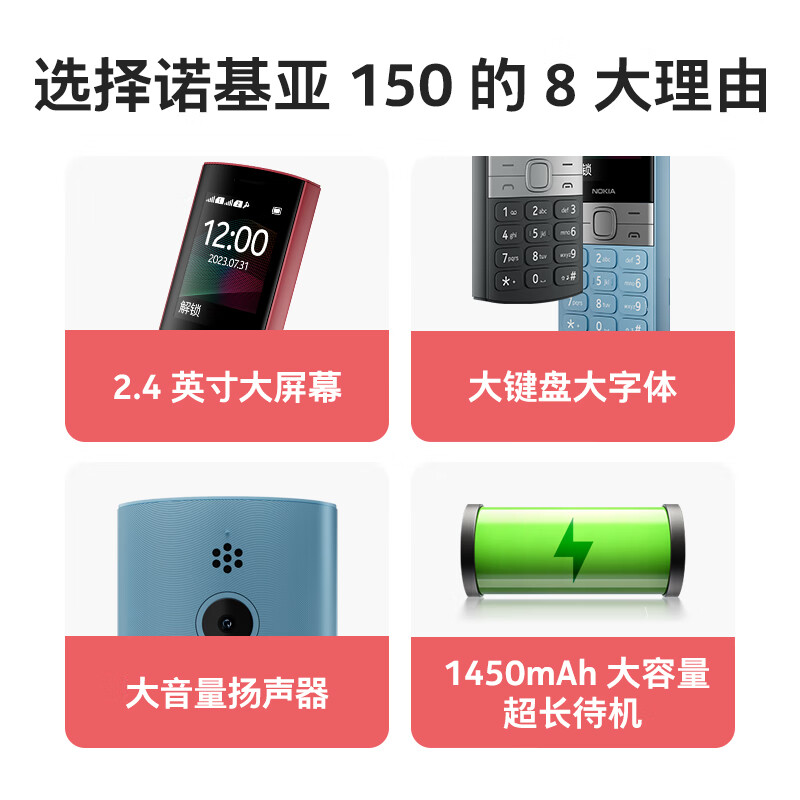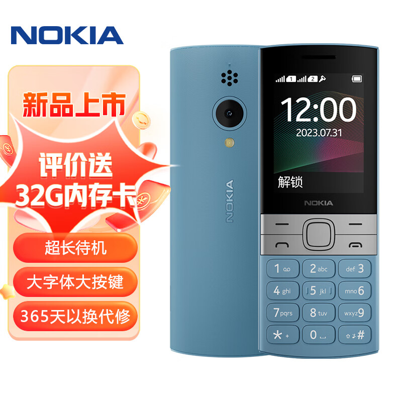 诺基亚(NOKIA)150蓝色 【2023新版】直板按键 双卡双待 学生手机 备用功能机 老人老年手机价格:229.00元!