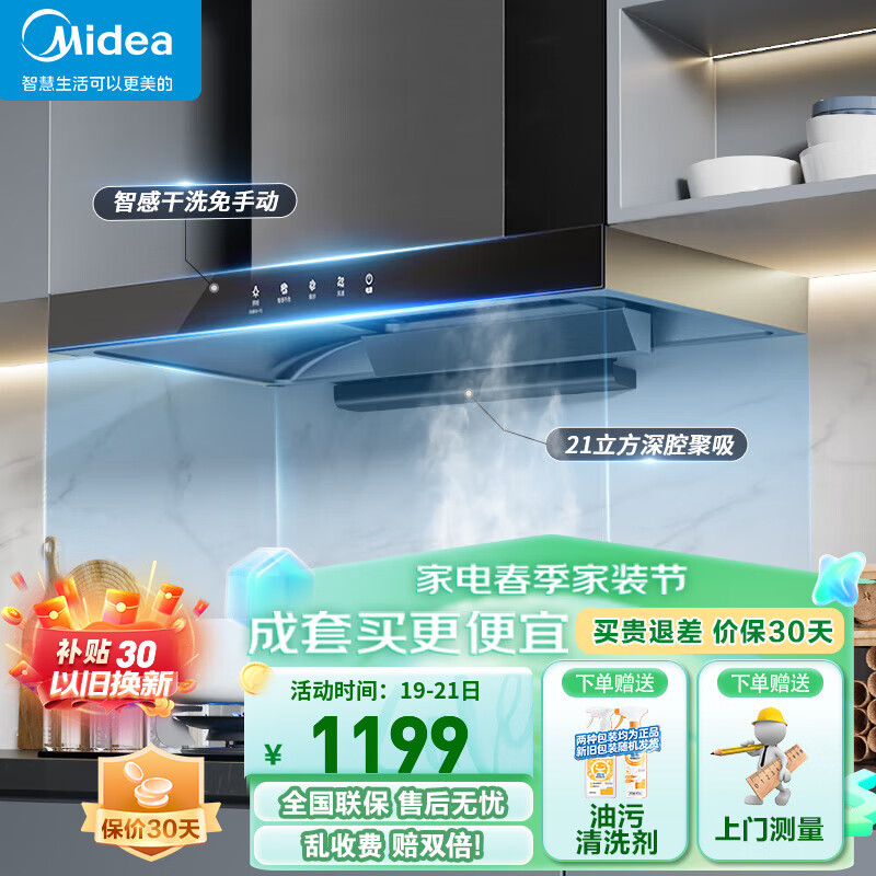 美的(Midea)抽油烟机 家用自动清洗 欧式21立方风量大吸力油烟机 顶吸抽烟机脱排油烟机 T201 智能干洗价格:1299.00元!