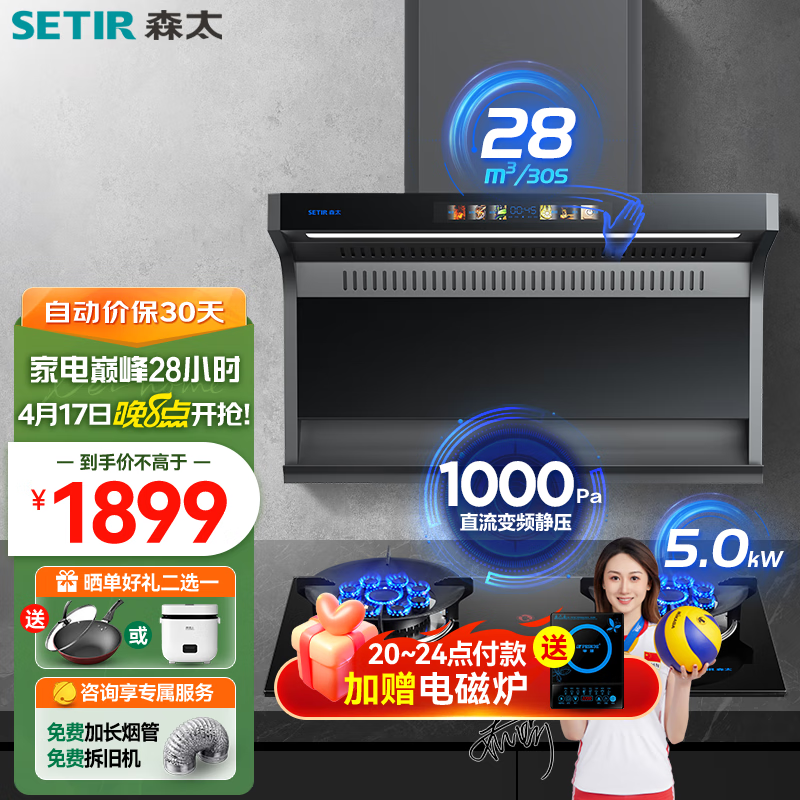 森太(SETIR)抽油烟机灶具套装 1000Pa变频顶侧双吸油烟机燃气灶套装 4.8kW九头猛火灶B929BQL+T282液化气价格:2199.00元!