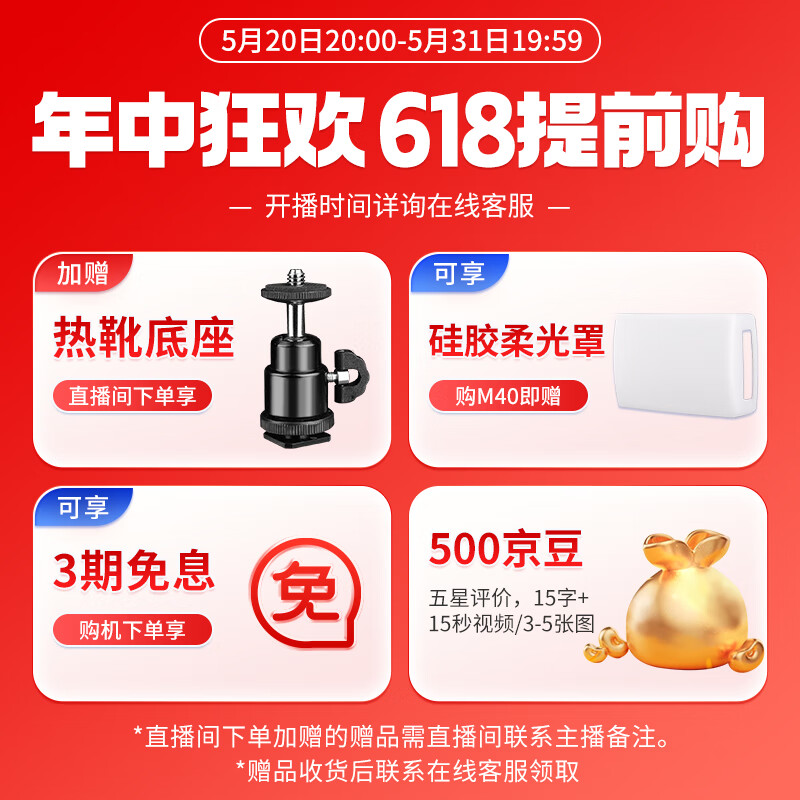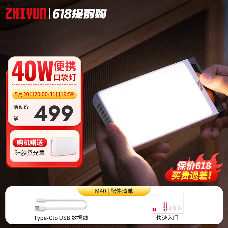 zhi yun智云五倍手持led补光灯摄影灯视频直播室内婚庆高功率便携口袋柔光灯M40价格:499.00元!