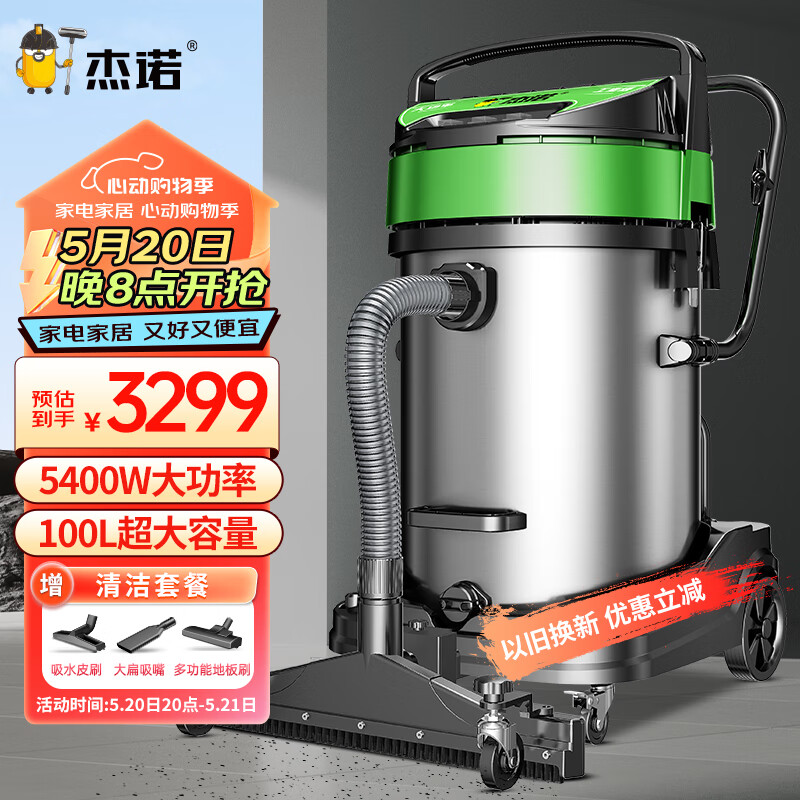 杰诺5400W大功率强大吸力干湿两用商用工业吸尘器工厂车间大型厂房粉尘吸水机JN-301T边推边吸价格:3599.00元!
