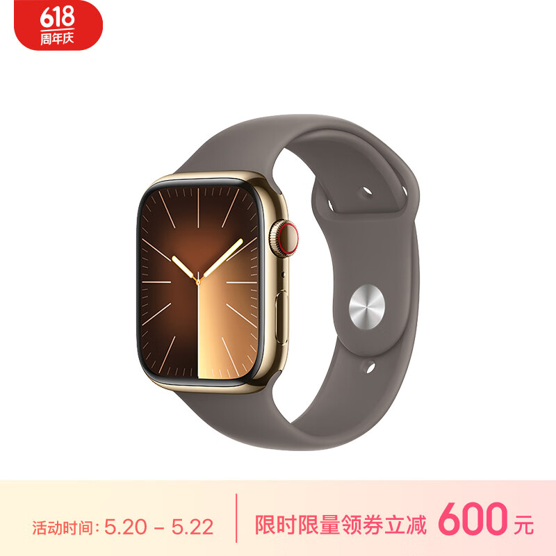 Apple/苹果 Watch Series 9 智能手表GPS+蜂窝款45毫米金色不锈钢表壳陶土色运动型表带M/L MRPL3CH/A价格:6199.00元!