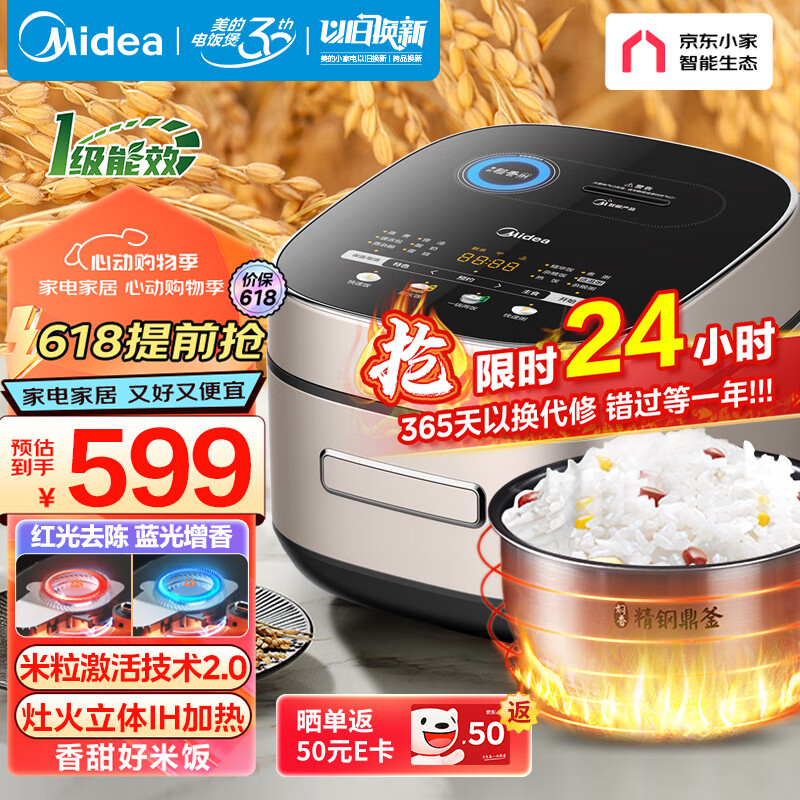 美的(Midea)风动稻香系列2代IH京东小家智能生态电饭煲Pro电饭锅家用4L彩屏WIFI智控蒸米饭锅HS407(3-8人)价格:599.00元!