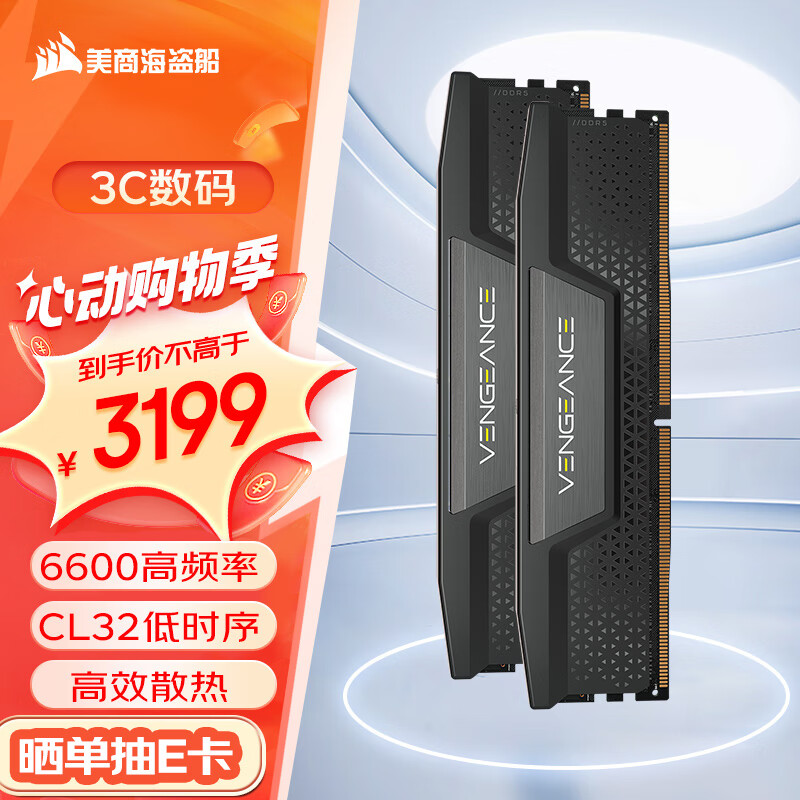 美商海盗船 (USCORSAIR) 96GB(48Gx2)套装 DDR5 6600 台式机内存条 复仇者系列 游戏条 黑色 C32价格:3199.00元!