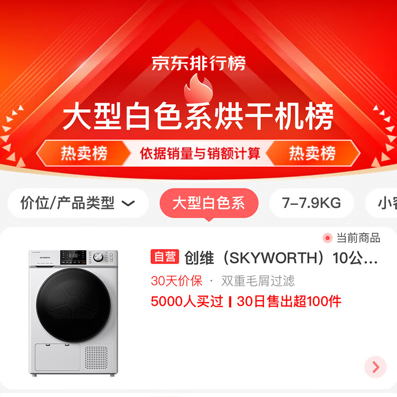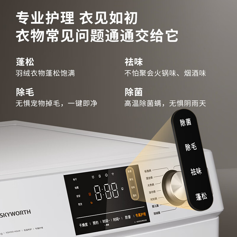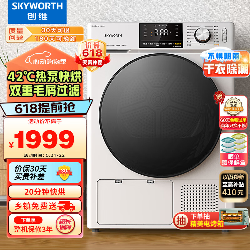 创维(SKYWORTH)10公斤烘干机家用热泵式干衣机滚筒全自动除螨除潮祛味除宠物毛发大容量XQH100-H56W价格:1999.00元!