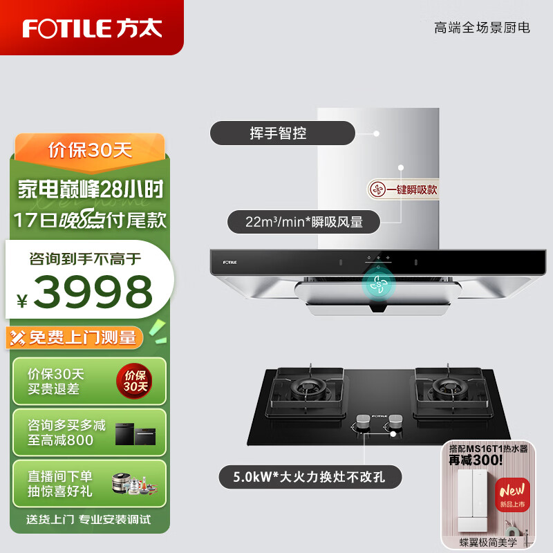 方太(FOTILE)方太抽吸油烟机烟灶套装 燃气灶烟机 欧式顶吸烟机灶具套装家用 22瞬吸风量烟灶套餐EMC5A+TH36B价格:3998.00元!