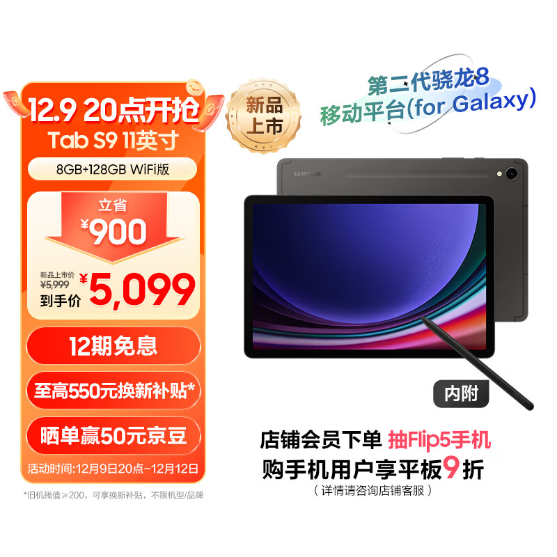 三星(SAMSUNG)平板电脑2023款Tab S9 11英寸 8G+128GB WIFI 骁龙8Gen2 顺滑全视屏 内附Spen 云影灰价格:5399.00元!