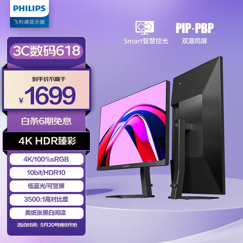 飞利浦 31.5英寸4K 10bit HDR低蓝光 分屏 旋转升降 设计办公显示器 娱乐大屏 电脑显示屏 32E1N5800L价格:1899.00元!