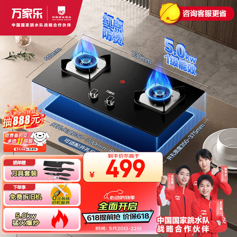 万家乐燃气灶 5.0kW大火力 台式嵌入式两用燃气灶 家用双灶高温防烫提醒 钢化玻璃全进风JZT-AY4天然气价格:599.00元!