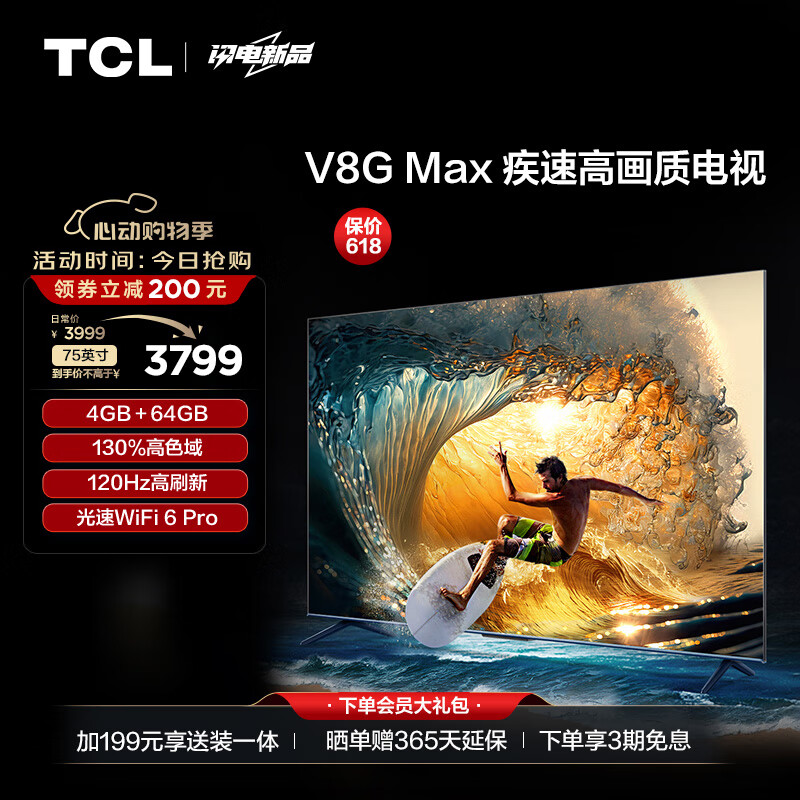 TCL电视 75V8G Max 75英寸 4+64GB 高色域 120Hz高刷 WiFi 6 Pro 4K超高清 客厅液晶智能平板电视机价格:3999.00元!