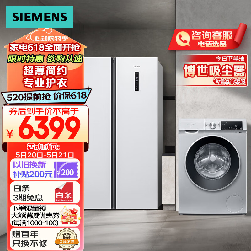 西门子(SIEMENS)冰洗套装502L超薄嵌入对开门冰箱+10kg除渍洗KA50NE20TI+WG52A108AW价格:7099.00元!
