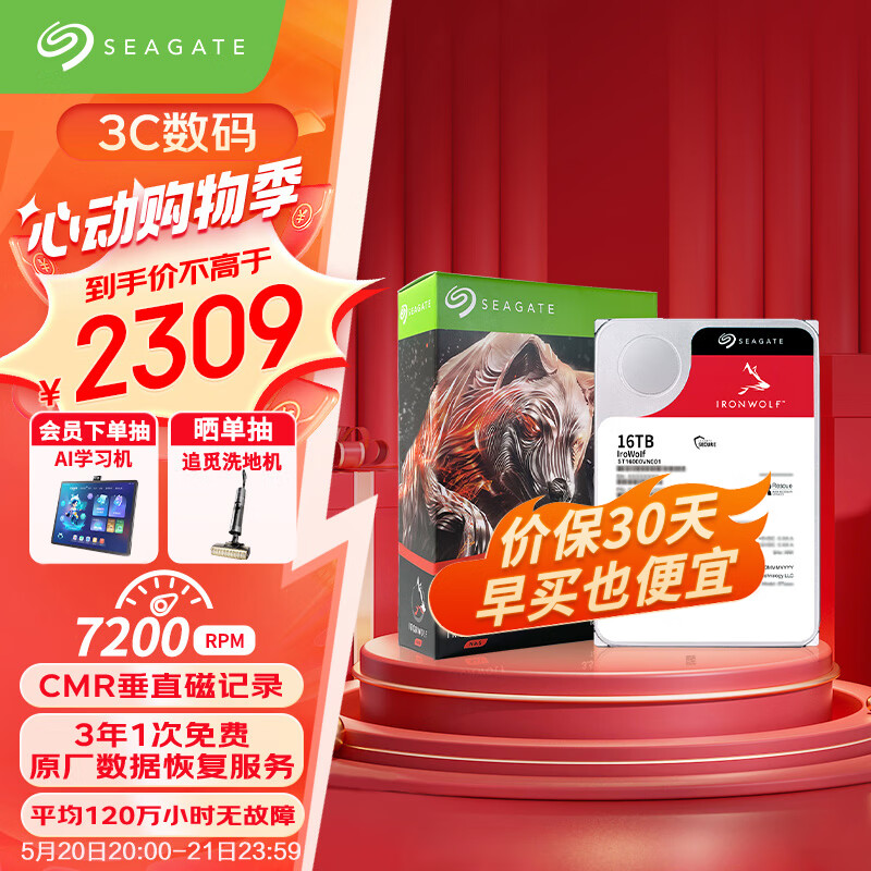 希捷(SEAGATE)NAS硬盘 16TB 256MB 7200转 CMR垂直 网络存储 SATA 希捷酷狼 机械硬盘 数据恢复服务 3.5英寸价格:2309.00元!