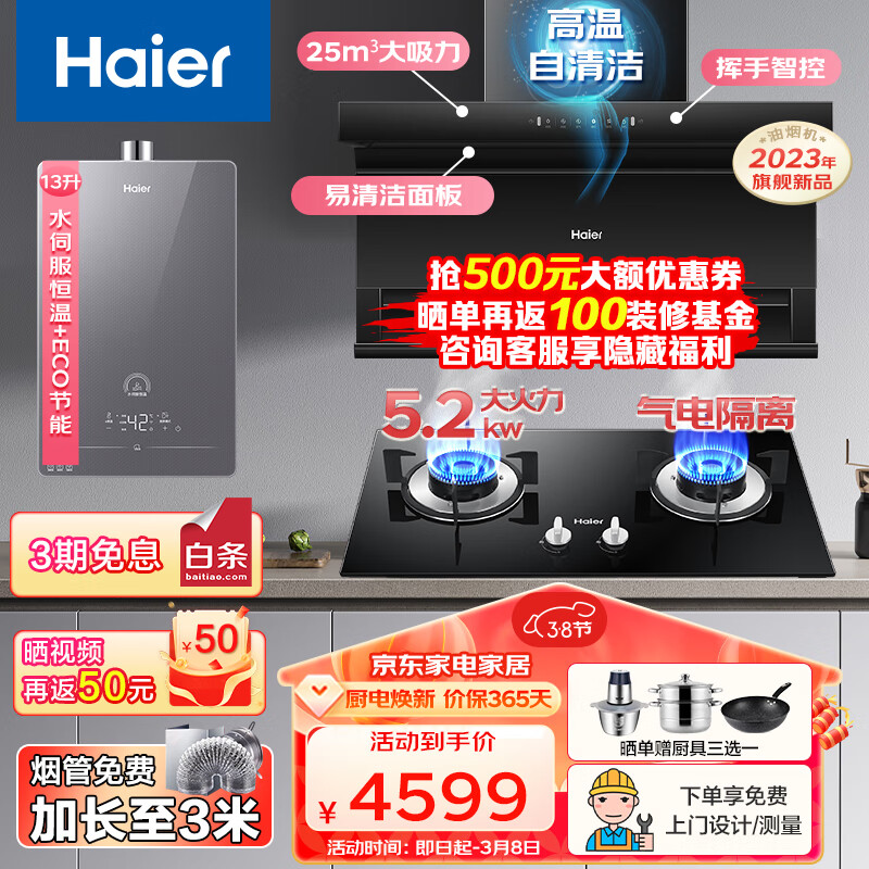 海尔(Haier)抽油烟机燃气灶套装25立方顶侧双吸自清洁EC725+5.2KW灶Q2BE50+13升水伺服HP5厨房三件套[家电]价格:5099.00元!