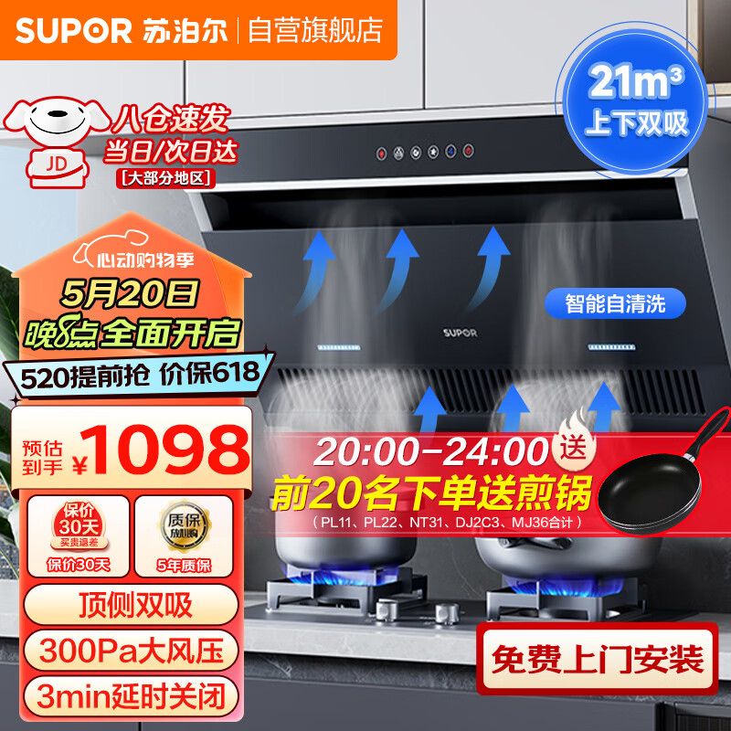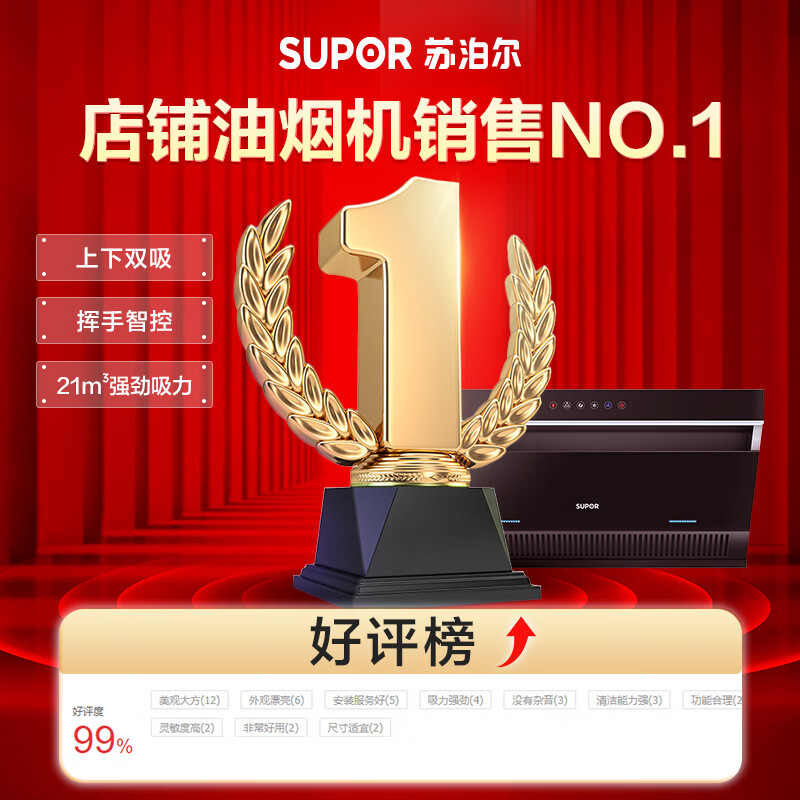 苏泊尔(SUPOR)油烟机侧吸式抽油烟机燃气灶家用厨房大吸力21立方爆炒大吸力挥手控制自清洗吸油烟机DJ2C3 21立方超大吸力价格:1095.00元!