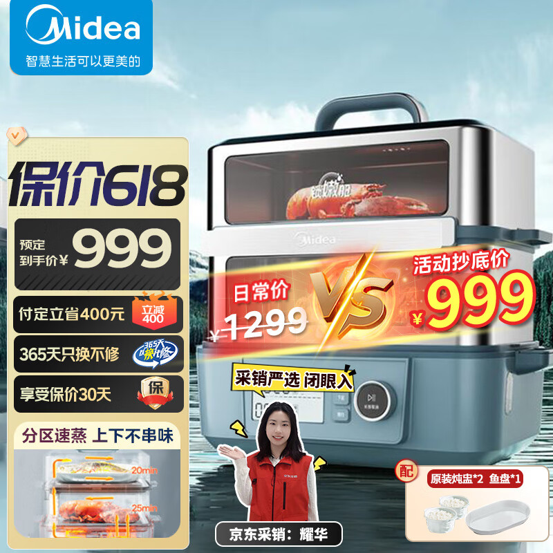 美的(Midea)锁嫩舱3.0家用电蒸锅智能烹饪多功能锅可视分区一锅多用不锈钢蒸炖锅锁嫩舱多用途锅MZ-ZGS352202价格:999.00元!